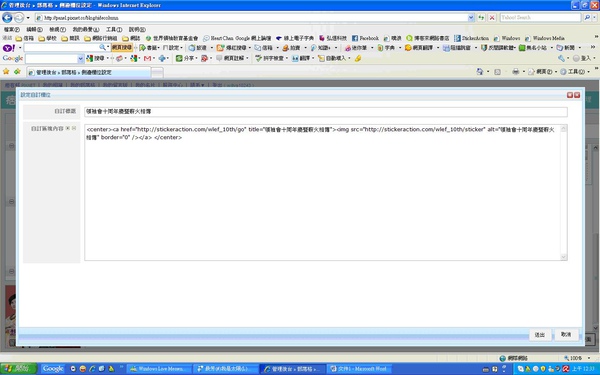 <a href="http://stickeraction.com/wlef_10th/go/"><img src="http://stickeraction.com/wlef_10th/sticker/" alt="領袖會十周年慶暨薪火相傳" border="0" /></a>